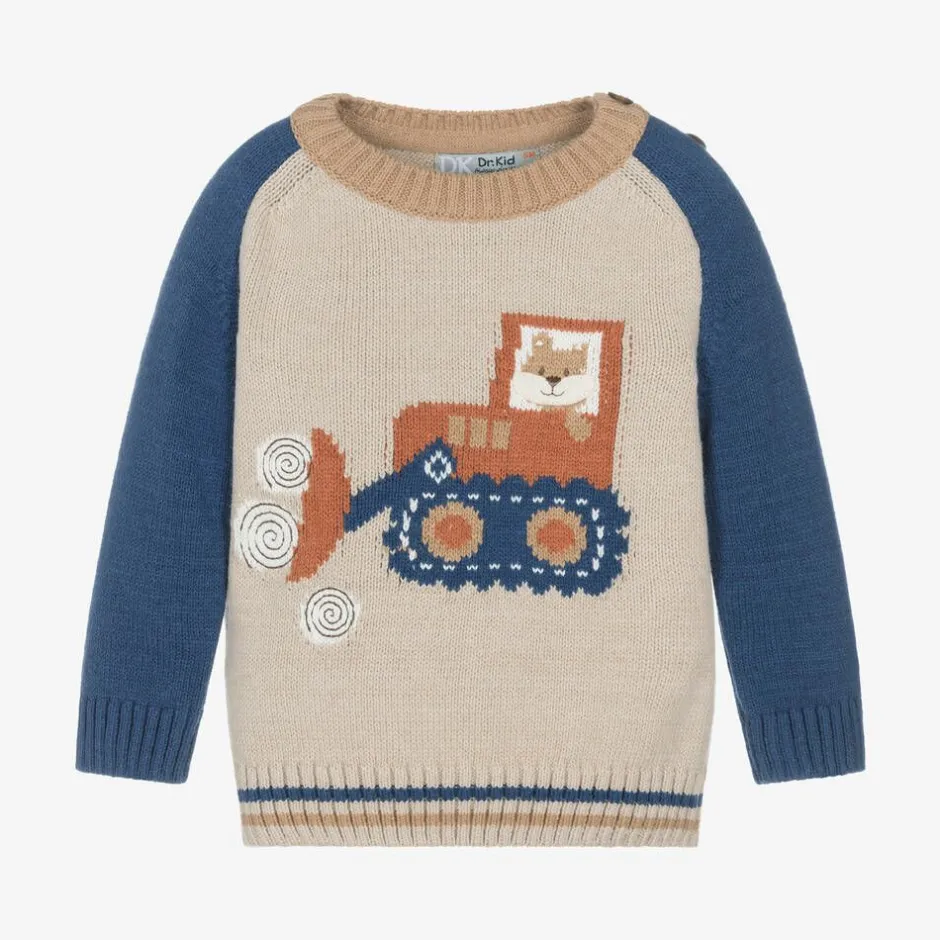 A cosy beige sweater for younger boys by Portuguese brand Dr. Kid, knitted in a soft cotton blend. Designed with long blue sleeves and a ribbed crew neckline, it has a cute intarsia knit tractor and bear design on the front in complementary shades of blue and beige. It is finished with a striped hem and to help with dressing, smaller sizes have button fastenings on one shoulder.