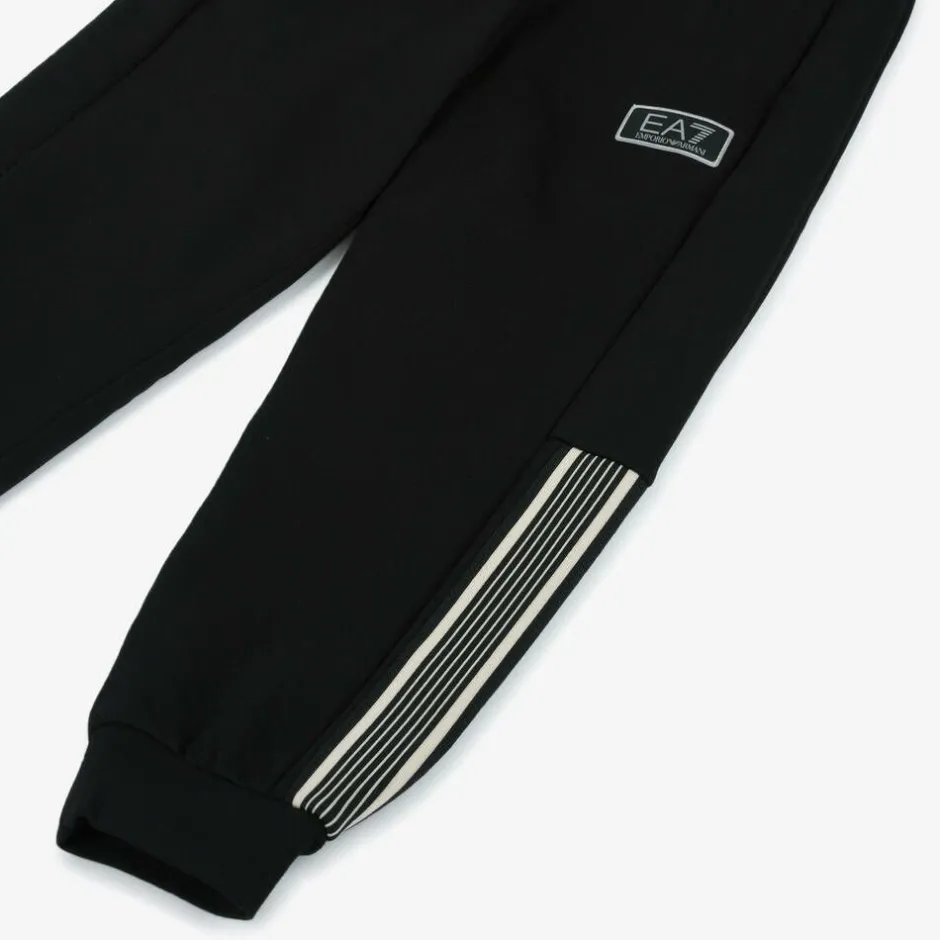 Sporty black tracksuit for boys by EA7 Emporio Armani. Made in soft cotton-blend jersey, the zip-up top has bold stripes down the sleeves and a signature EA7 logo badge on the chest. The coordinating joggers have a drawstring on the inside of the waist for comfort and complete the casual, relaxed look.
