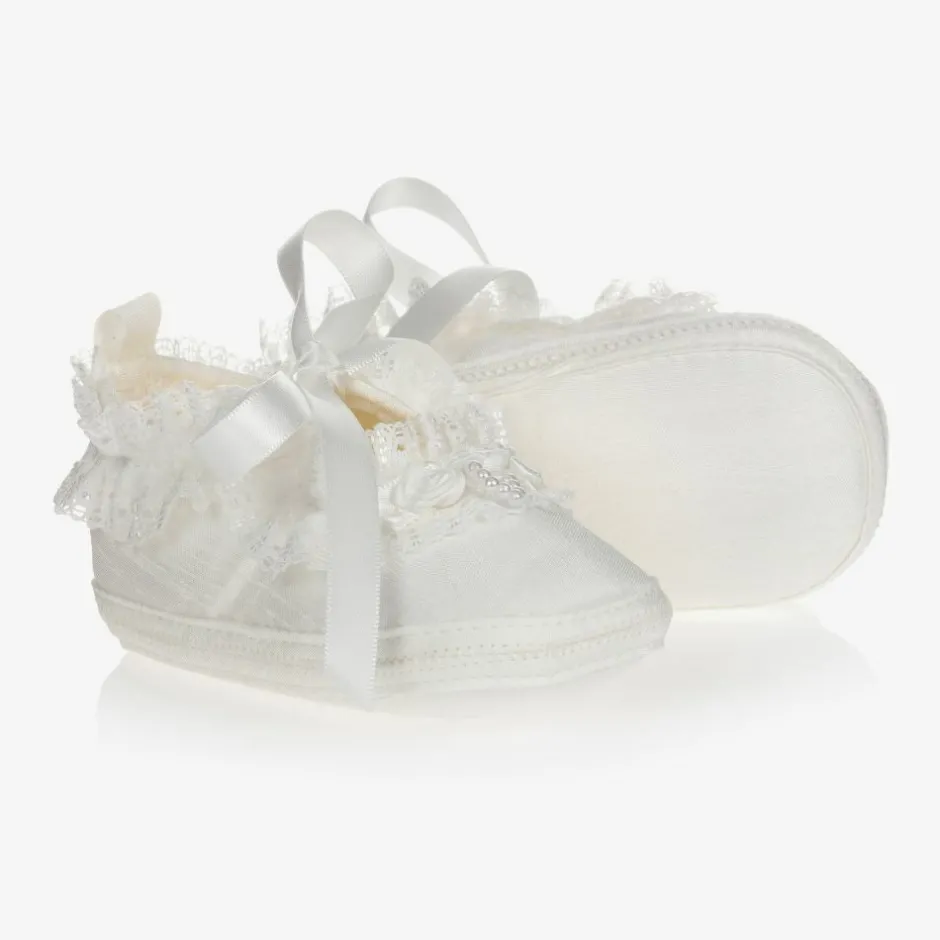 Early Days ivory silk dupion pre-walker baby shoes, perfect for special occasions. They have a comfortable and absorbent lining, ribbon laces and are embroidered with lace frills, rosebuds and pearl beads.