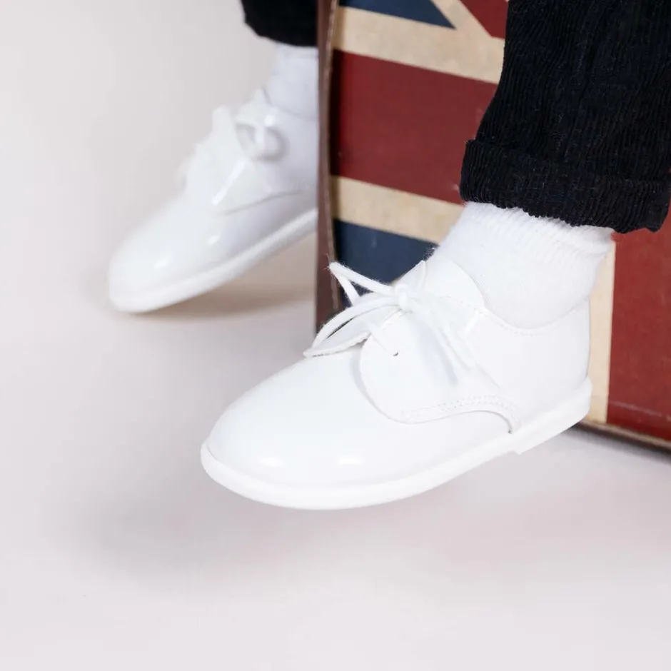 Little boys white first walker shoes by Early Days, with laces to fasten. From the designer's Baypods collection, they are made from soft faux leather, with a fabric lining and inner sole. Traditional in style, they have ankle support and flexible rubber outer soles.