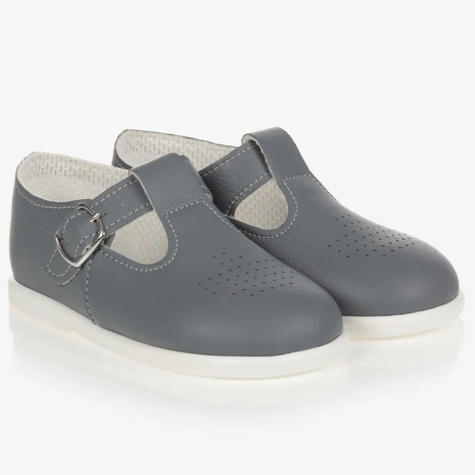 Grey first walker shoes for little boys and girls from British brand Early Days, in a traditional T-bar style. Made in soft faux leather with a charming punched hole pattern on the toes, they have a textile lining and a lightly cushioned insole for comfort. These classic shoes fasten with an adjustable silver buckle and have flexible non-slip rubber soles.