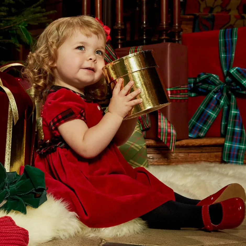 Early Days bright red leather shoes for baby girls, made in a traditional, 'Mary Jane' style. They have a bar strap and pretty scalloped edge. The unstructured sole is made from soft yet durable synthetic suede.