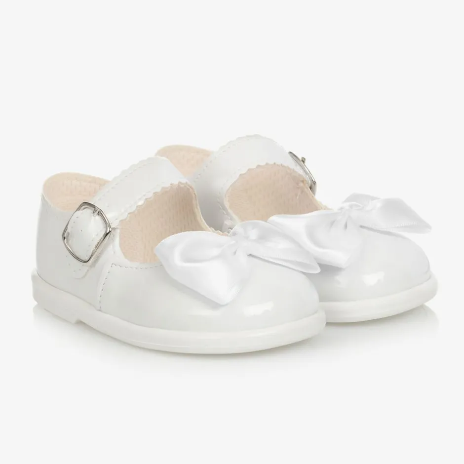 Girls smart, white patent shoes with satin bows, by Early Days. Made in soft faux patent leather, they have a lightly padded fabric lining. There are white non-slip rubber soles and they fasten with an adjustable buckle. They come with pretty scalloped edges.