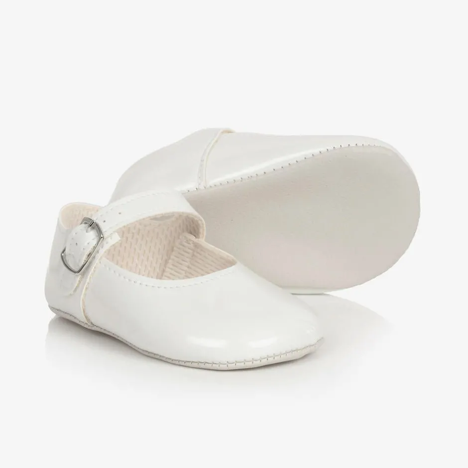 Early Days white pre-walker shoes made from synthetic, patent leather. Made in a classic style they have a buckle fastening and a comfortable absorbent lining.