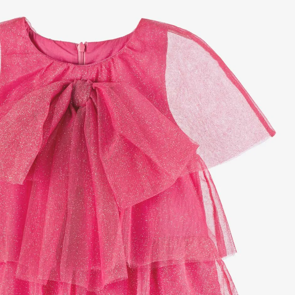 Glamorous and glittery, this fuchsia pink dress for girls is by EIRENE. Designed to make an impact, the dress is made in tiered layers of tulle, with a cape-style covering around the shoulders and a large, fixed bow on the front as a flamboyant, finishing touch. It is lined in a double layer of voile and fastens with a concealed zip around the back.