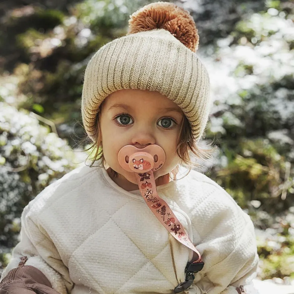 Beige dummy for baby girls and boys by Elodie, with a Florian the Fox print. It is made with TRITAN plastic that is durable, impact-resistant and BPA-free. It has a food-grade silicone orthodontic teat, shaped to prevent dental problems and promote the healthy development of baby’s teeth and jaw. The curved shape fits easily under the nose and ventilation holes allow air to circulate.