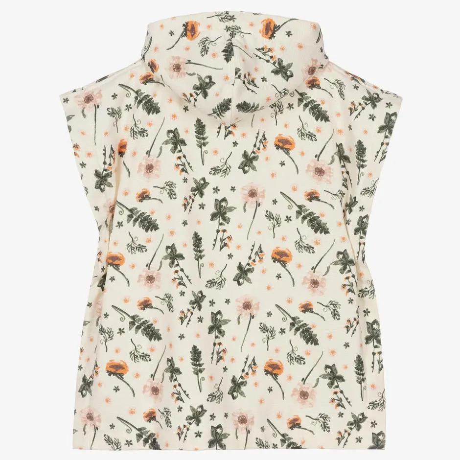 Ivory floral hooded poncho towel for little girls by Swedish brand Elodie, with a lovely pink, beige and green botanical pattern. Ideal for use at home, on the beach or by the swimming pool, this cotton poncho has an absorbent waffle weave with a soft towelling interior. The sides have a single popper fastening for a comfortable fit.