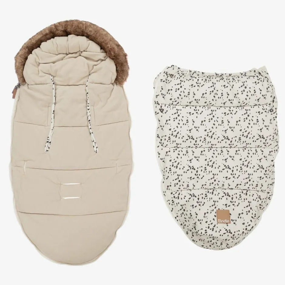 Lovely ivory footmuff for baby boys and girls by Swedish brand Elodie, patterned with a spotted Dalmatian print. Padded for warmth and lined in cosy polar fleece, this stroller accessory has holes on the back to thread a harness through. It fastens with a smooth zip along the side and the bottom to help easily get baby in and out. The detachable faux fur trim adds a luxurious touch.