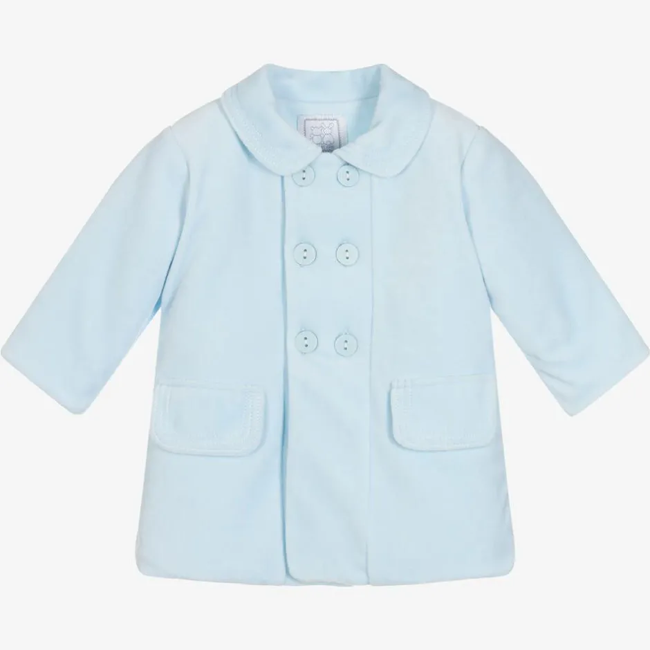Lovely pale blue coat for baby boys by Emile et Rose, made in super soft cotton velour. It has a traditional double breasted style and faux front pockets. Lightly padded, it is lined with soft jersey for comfort.