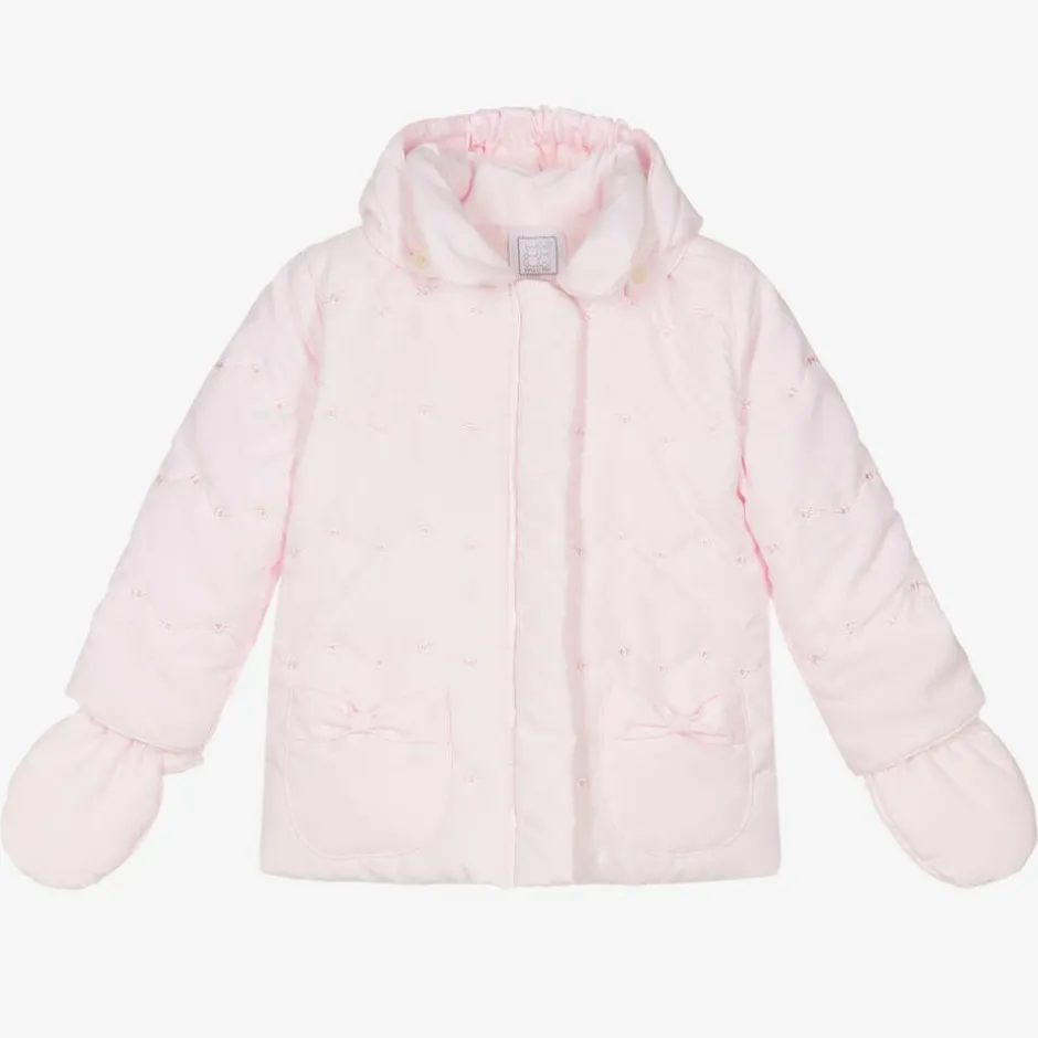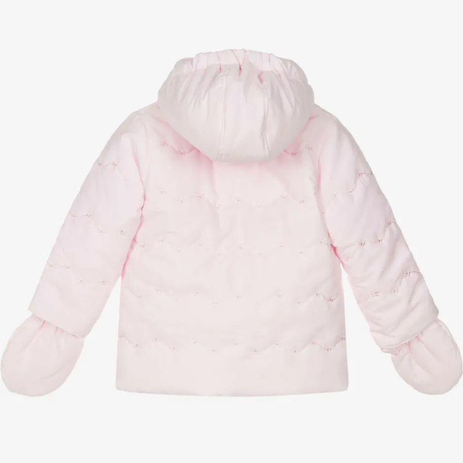 Pale pink jacket for baby girls by Emile et Rose, with warm, mid-weight padding. Beautifully embroidered with pink rose buds, this cute outerwear piece has girly pockets with bows on the front. Fully lined in cotton-blend jersey for comfort, it has a detachable hood and mittens, secured with buttons.
