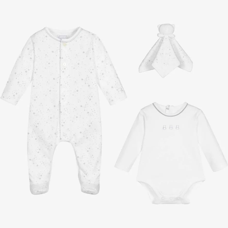 Adorable white babysuit set for boys and girls by Emile et Rose, presented in a branded gift box. Each piece is made in soft cotton jersey for gentle comfort against babies delicate skin. The babygrow has a grey star pattern, fold-over scratch mitts, and button and popper fastenings for ease when dressing. The bodyvest has teddy bear logo embroidery on the front for a sweet look. The cute doudou completes the lovely set, making it ideal for a new arrival.