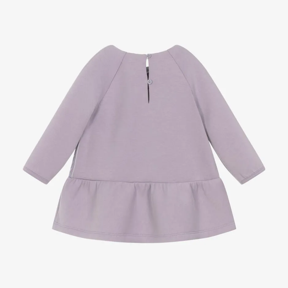 A lovely lilac purple dress for baby girls by Italian brand Emporio Armani, made in a soft and comfortable cotton-blend jersey. Designed in a dropped waist style, it has a gathered skirt and long sleeves. There is a double keyhole button fastening on the back, with an embroidered Eagle logo on the chest and Eagle logo tape trims on the sides for a signature finish.