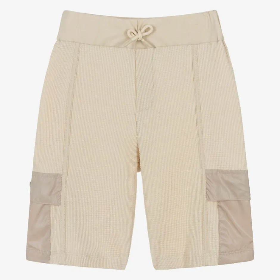 Casual beige cargo shorts for boys by Italian label, Emporio Armani. They are made in soft waffle organic cotton jersey with an elasticated waist and faux drawstring ties. Silky patch pockets on each leg add a stylish touch, with the signature Eagle logo on one side for a distinctive finish.