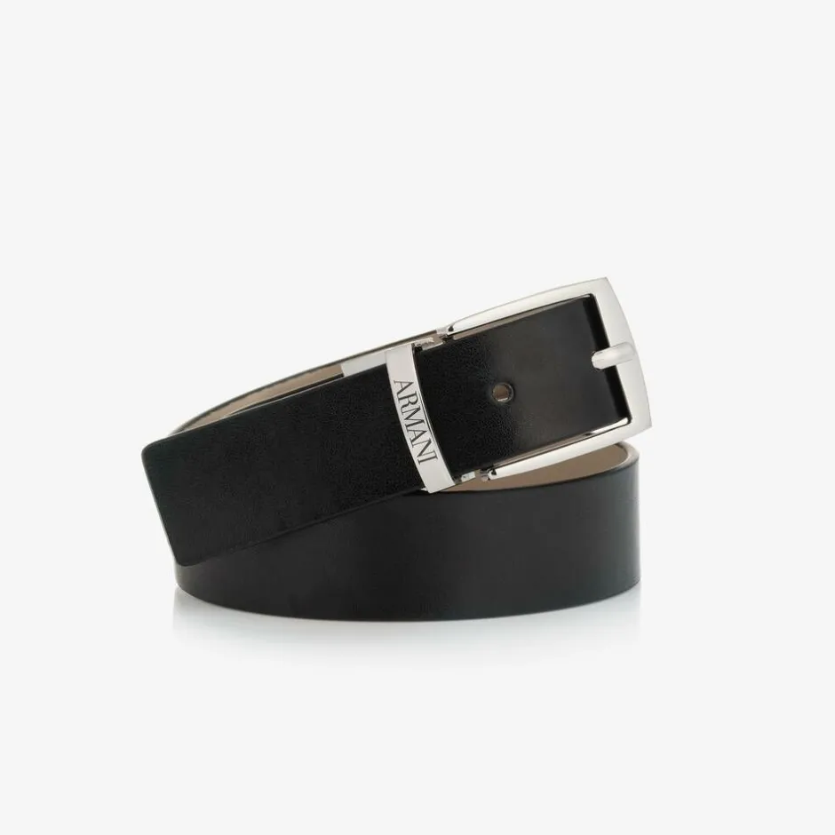 A smart reversible belt for boys by Italian brand Emporio Armani, black on one side and light beige on the other side. This classic accessory is made in luxuriously soft and smooth faux leather. Offering two looks in one, the adjustable silver-tone metal buckle simply twists around to switch sides and has an embossed logo for a distinctive look.