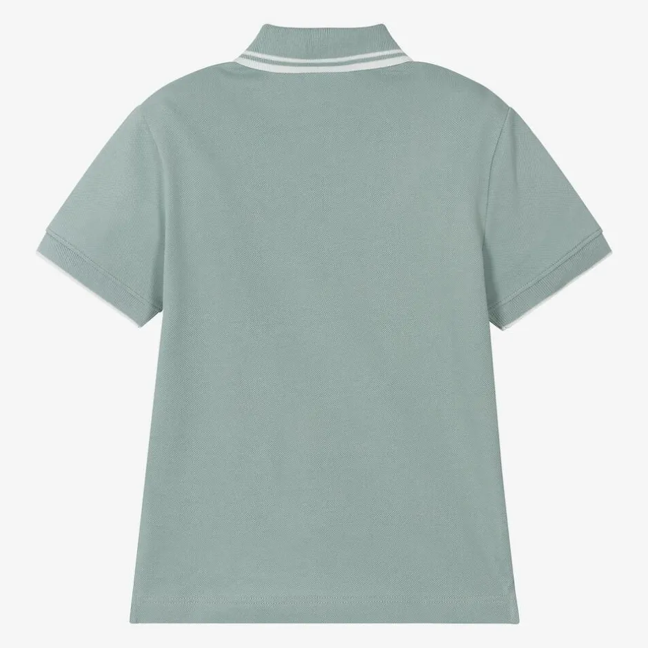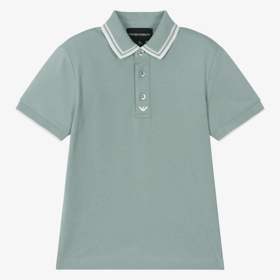 Green-blue cotton short-sleeved polo top for boys by iconic Italian designer Emporio Armani, with white tipping. Endlessly comfortable, it is made in soft, stretchy piqué, with branded buttons and an embroidered white Eagle logo on the placket. There are vents on the hemline for extra comfort.