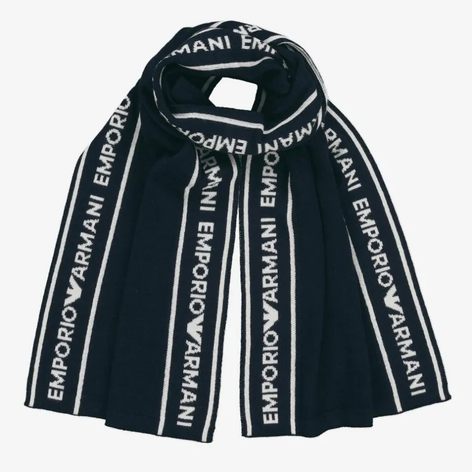 Navy blue scarf for boys by Italian fashion house Emporio Armani. The ideal accessory to add warmth and style to his winter outfit, it is finely knitted in a beautifully soft wool blend. For brand recognition, it is trimmed with white logo panels along the edges.