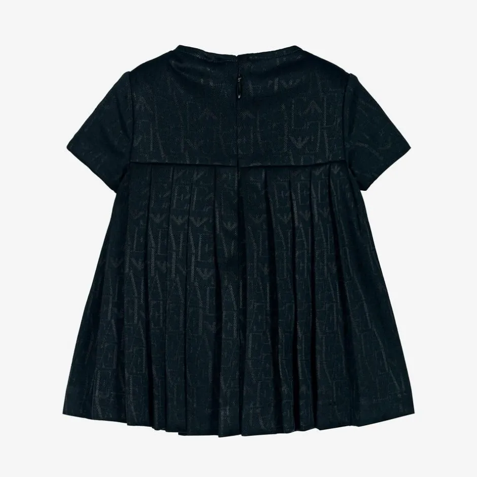 In dark navy blue, this lovely pleated dress for little girls is by luxury brand Emporio Armani. It has an all-over tonal logo pattern for a subtle designer look. Made in stretchy jersey and fully lined for a comfortable fit, it fastens with a concealed zip on the back for a neat finish.