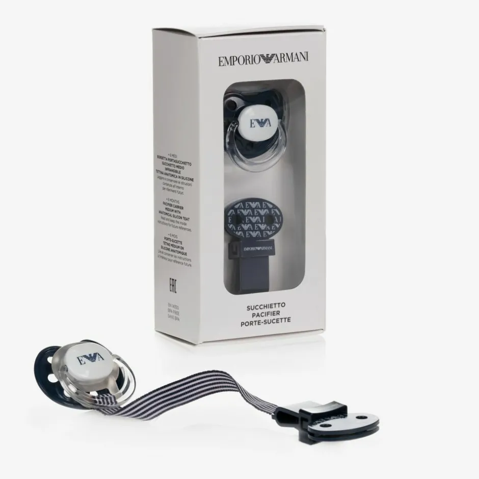 Baby boys navy blue dummy and clip set with the Eagle logo branding by Emporio Armani. The dummy has an anatomical silicone teat with a hard plastic holder and a clip with a striped fabric strap to fasten onto clothing.