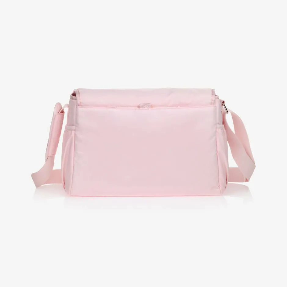 Practical and smart pale pink Emporio Armani changing bag, with a silver-tone Eagle logo plate. Smooth with branded trims, the main compartment has multiple pockets for easy organisation and magnetic popper closures on the flap. It has an adjustable shoulder strap and fixed stroller straps which can be neatly tucked away when not in use. It comes with a foldable changing mat and an insulated bottle bag.