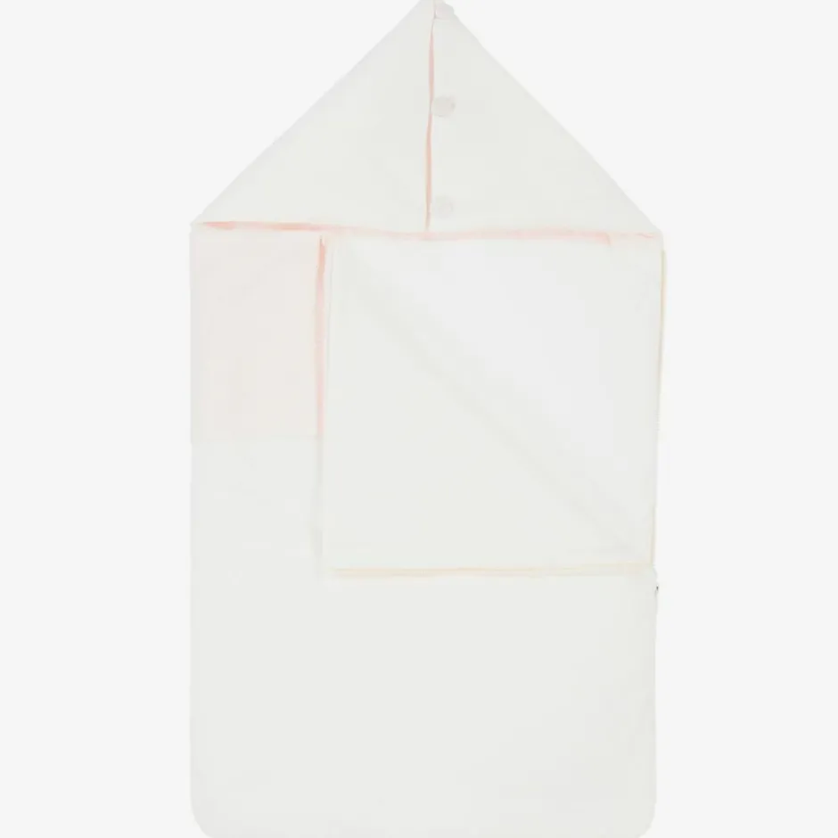 Ivory nest for baby girls by Emporio Armani, made in soft cotton jersey. The hood lining and front panel are made in luxury soft cotton, with a pale pink Eagle logo pattern. The nest is lightly padded and the hood can be unbuttoned and used as a pillow.