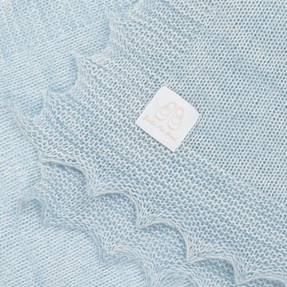 A lovely pale blue cobweb shawl by English Trousseau for baby boys and girls. It is made from the finest soft wool, knitted in Nottingham, England using ancient framed knitting techniques. Large enough to wrap around baby, the shawl makes an ideal gift and comes beautifully presented in a smart box.