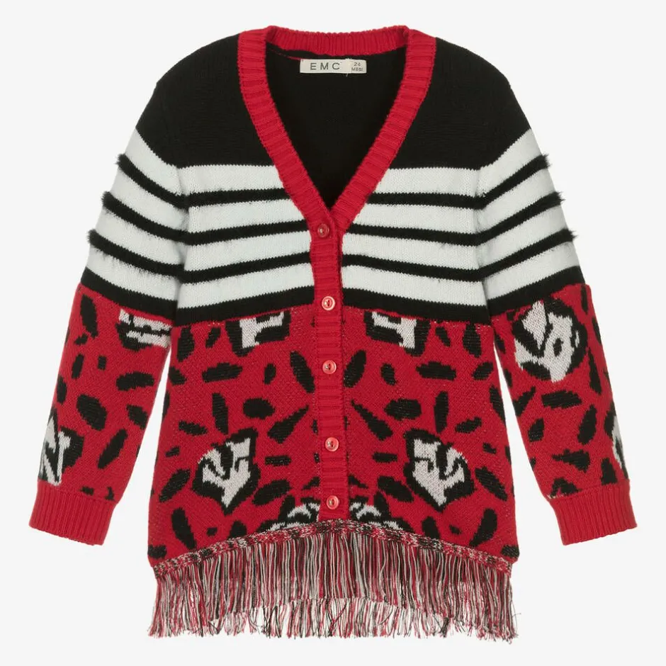 Girls red, white and black long-sleeved cardigan by Everything Must Change, with an abstract and stripe design. Made in a soft cotton and wool knit, this cosy piece has coordinating tassels trimming the hem. It has a V-neckline, stretchy ribbed cuffs and fastens with buttons on the front that are detailed with a little diamanté for added sparkle.