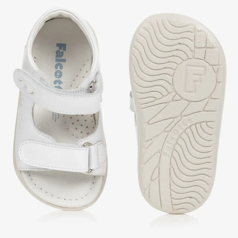 A practical pair of white leather sandals for girls, from Italian brand Falcotto by Naturino. These sandals fasten with convenient velcro straps, and have a non-slip rubber sole. Lined in soft, supple leather, the padded insole is designed to cushion and support delicate little feet.