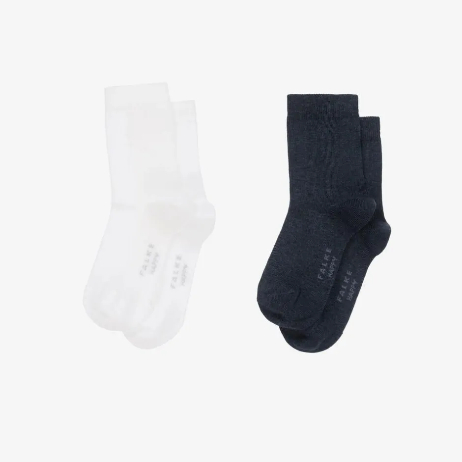 Two pairs of ankle socks for boys and girls by Falke, made in a soft cotton blend. Comfortable for everyday wear, one pair is navy blue and the other pair is white.