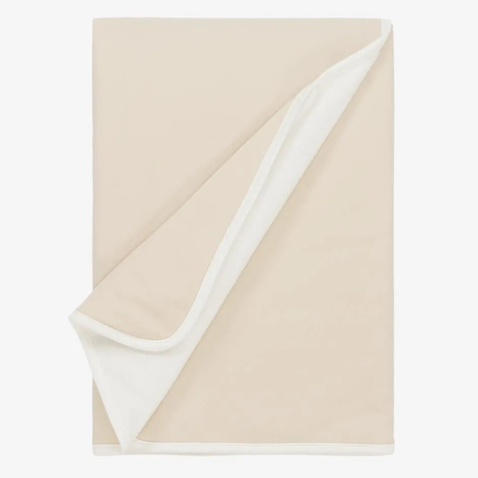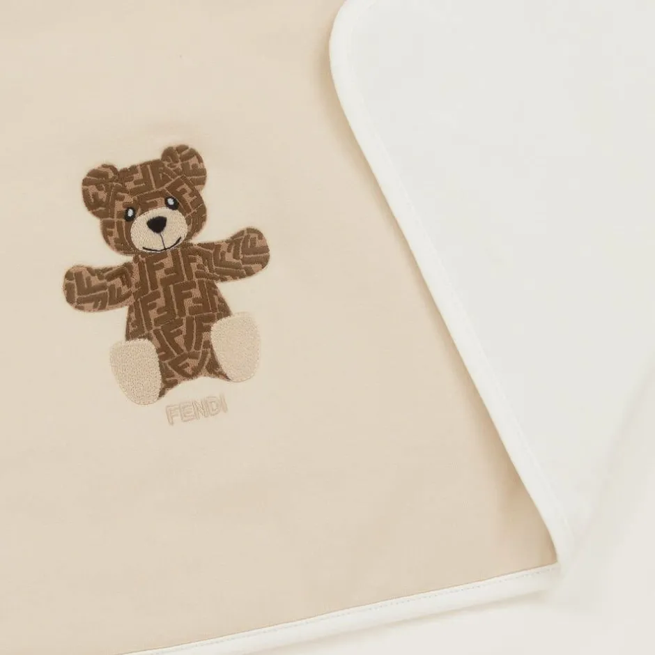 Lovely beige blanket for baby boys and girls by luxury Italian brand, Fendi. Made in soft cotton jersey, this neutral nursery accessory is embroidered with an adorable FF teddy bear. Softly padded, it makes a comfortable surface to lay your little one on.