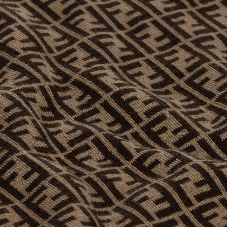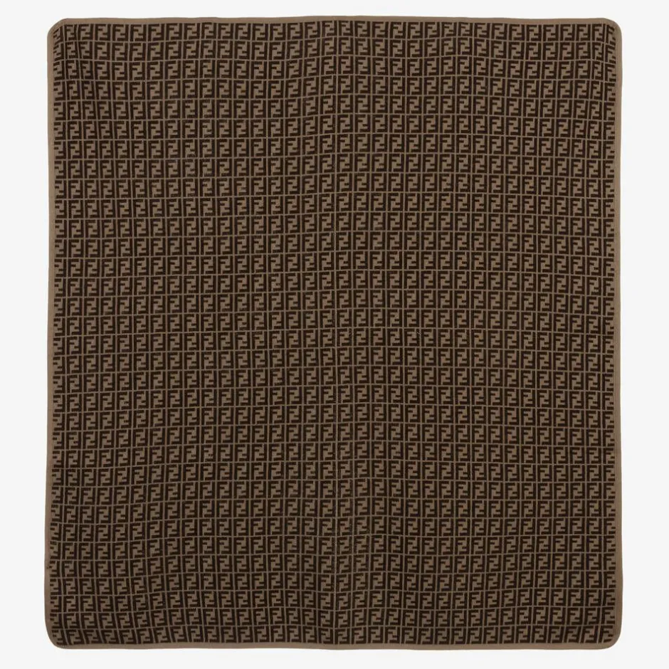 Brown and beige blanket for baby boys and girls by luxury Italian brand Fendi. Beautifully soft, it is knitted in a cotton and cashmere blend, with the brand's iconic FF logo pattern on both sides for a distinctively Fendi look.
