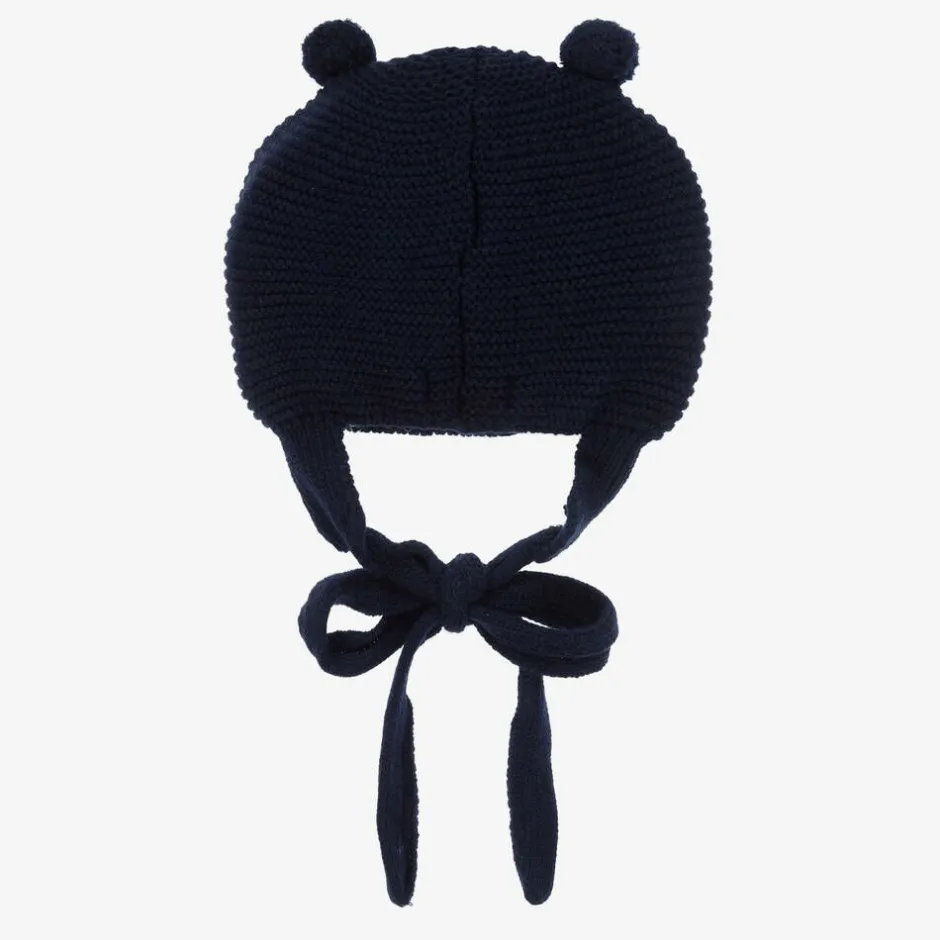 Cute and cosy for little boys and girls, this navy blue hat from Spanish brand Foque has two small pom-poms on the top. Knitted in a soft wool blend with a lovely garter stitch pattern, it has cosy ear flaps and fastens with knitted ties under the chin.