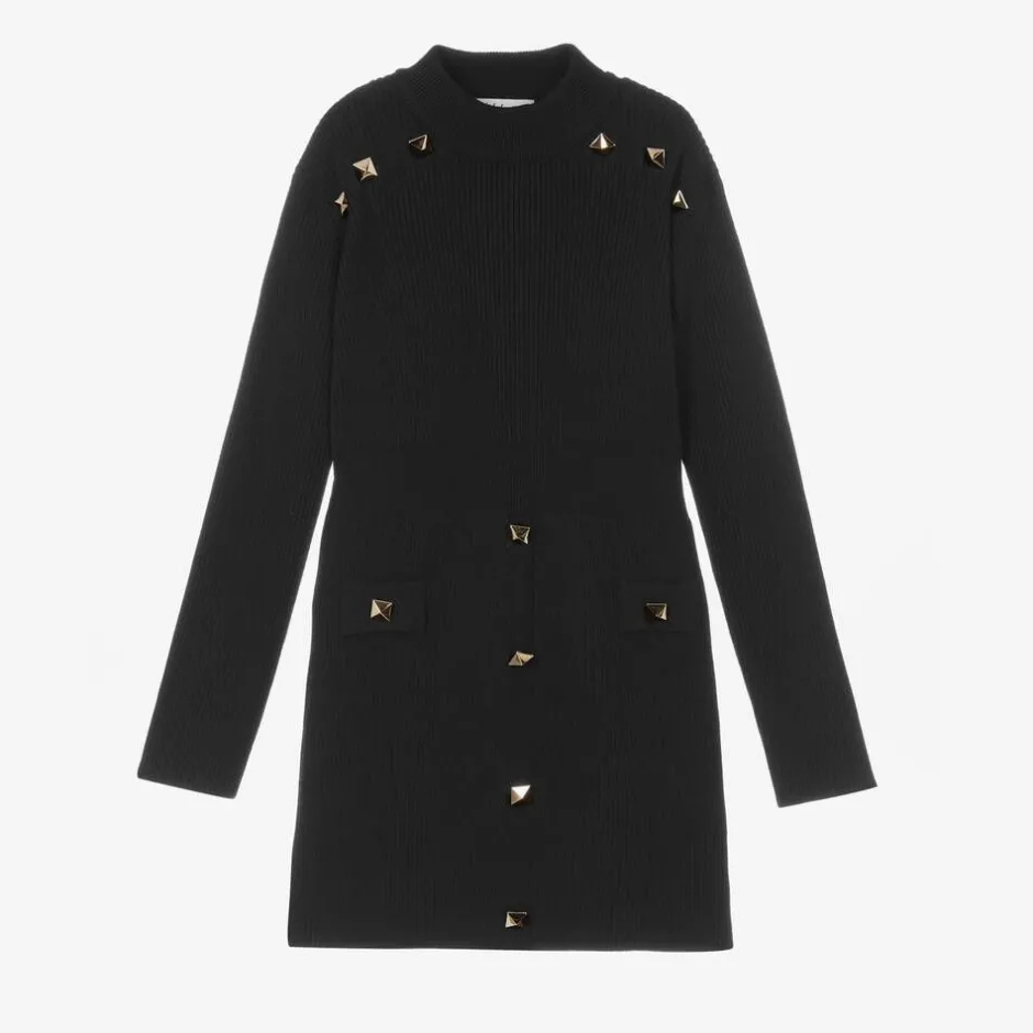 A stylish black long-sleeved dress for older girls from H.Love by Fun & Fun. Soft and mid-weight, it is made from a ribbed viscose-blended knit and has a high neckline. This chic form-fitting style is decorated with shiny gold studs on the shoulders, the skirt, and the faux pockets for an edgy finish.