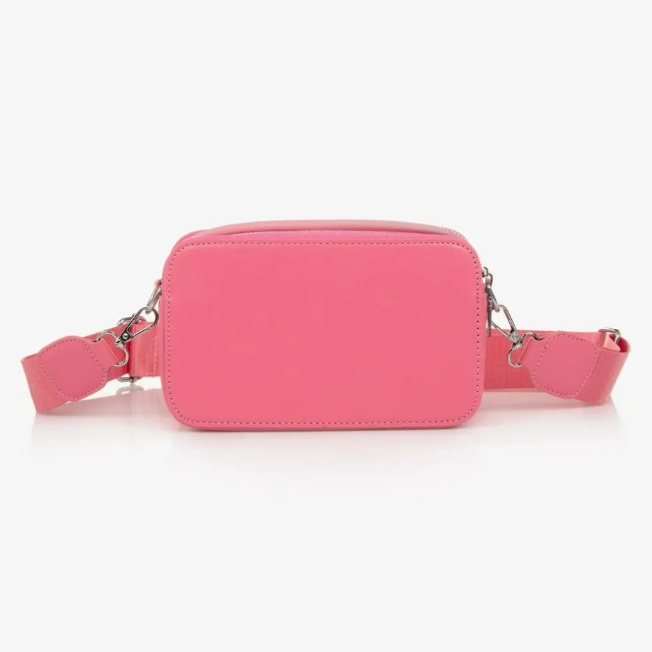 Bright pink faux leather shoulder bag for girls from H.Love by Fun & Fun. Ideal for carrying essentials this compact bag has an adjustable strap for shoulder or cross-body wear. The double zip fastenings and silver studs on the front give an alternative finish.