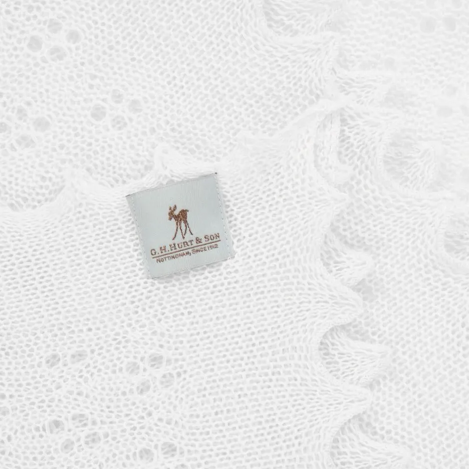 A charming white gift set for baby boys and girls by G. H. Hurt & Son, beautifully presented in a box. Handcrafted using traditional artisan techniques, the wool and cotton blend shawl is knitted in a lightweight lace design with scalloped edges. It is luxuriously soft and lightweight, ideal for wrapping newborns in a comforting embrace. The double-layered bib is made from delicate micro modal and organic combed cotton, featuring a signature fawn motif and tonal picot stitching. It fastens with a popper on the neck. A wooden brush with natural bristles completes the heirloom set.