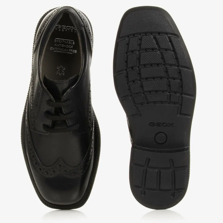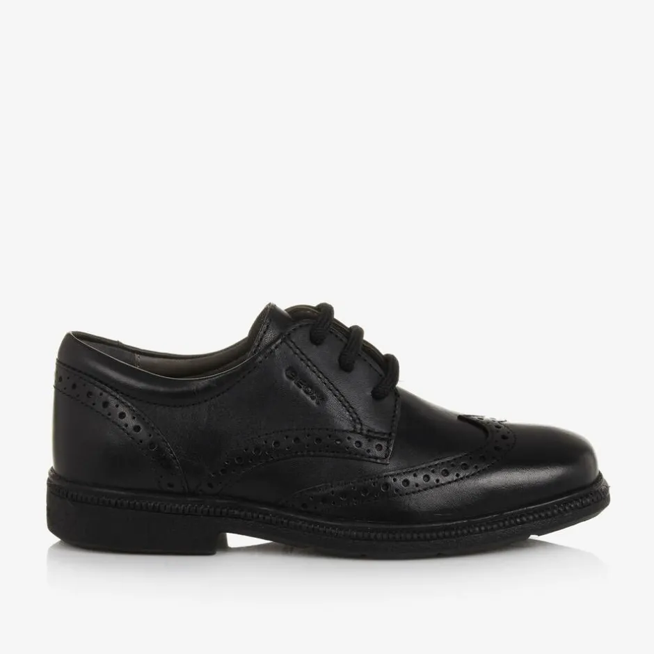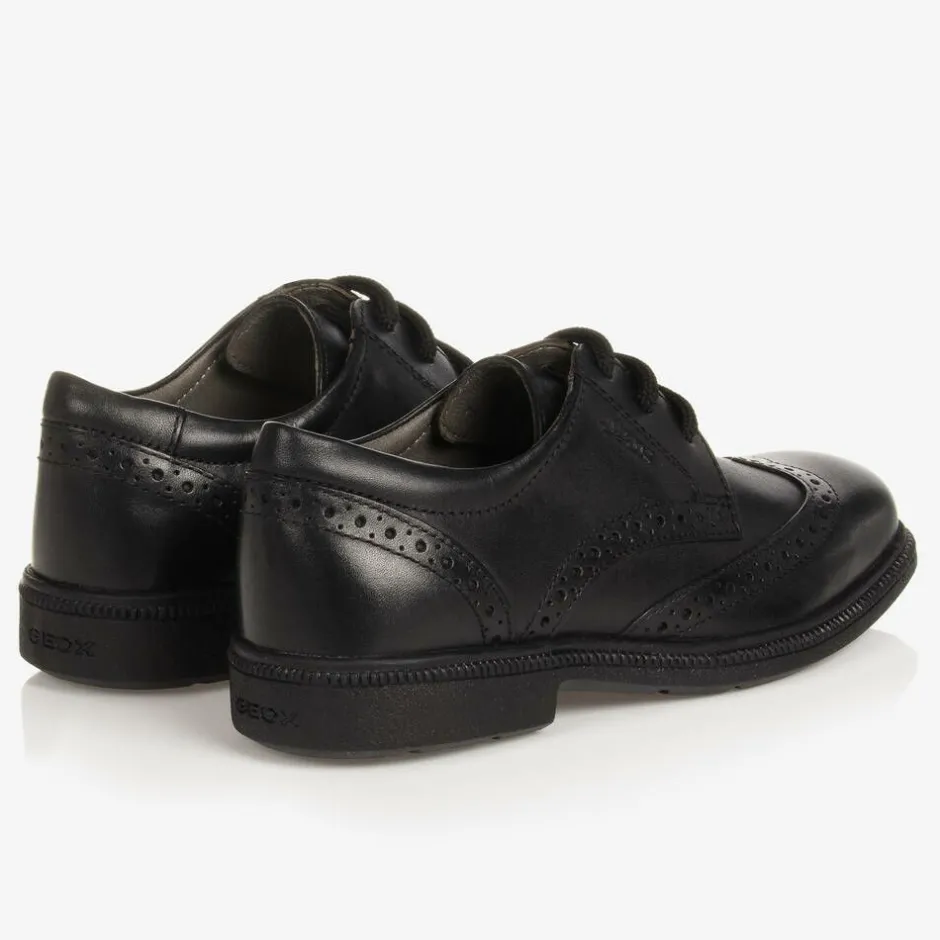 Boys black leather lace-up brogues by Geox. Ideal for school, they are breathable with shock-absorbing inner soles and durable non-slip outer soles. Classically styled, they have decorative perforations for a traditional finish.
