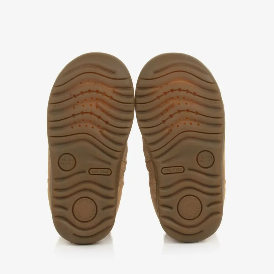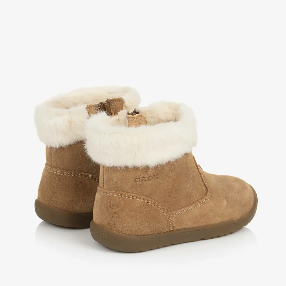Lovely beige suede leather boots for little girls from Geox, with a warm faux fur trim and lining. Part the brand's Respira range, they feature thermal insulation and a removable, wool blend insole for extra toastiness while keeping feet breathable on colder days. Comfortable to wear, they have an ergonomic shape, a flexible rubber sole and a side zip fastening with a velcro tab to secure at the top.