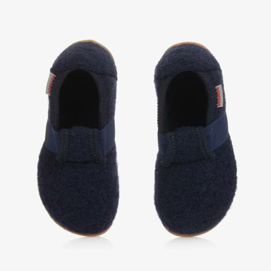 Navy blue slippers for boys and girls by Giesswein. Easy to slip on, they are made from soft felted virgin wool and have an elasticated strap across the front. Comfortable to wear, they have a beige rubber outsole with anti-slip technology for enhanced grip.