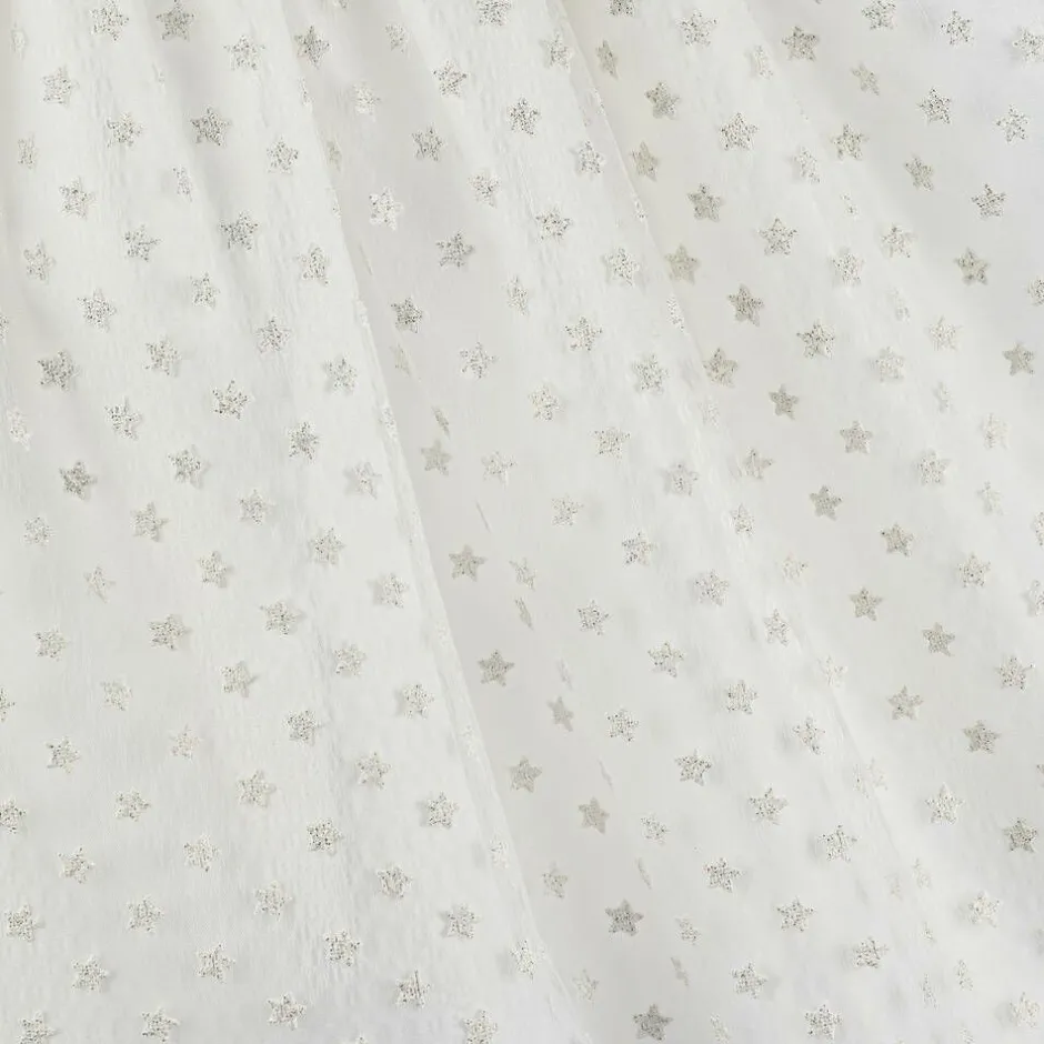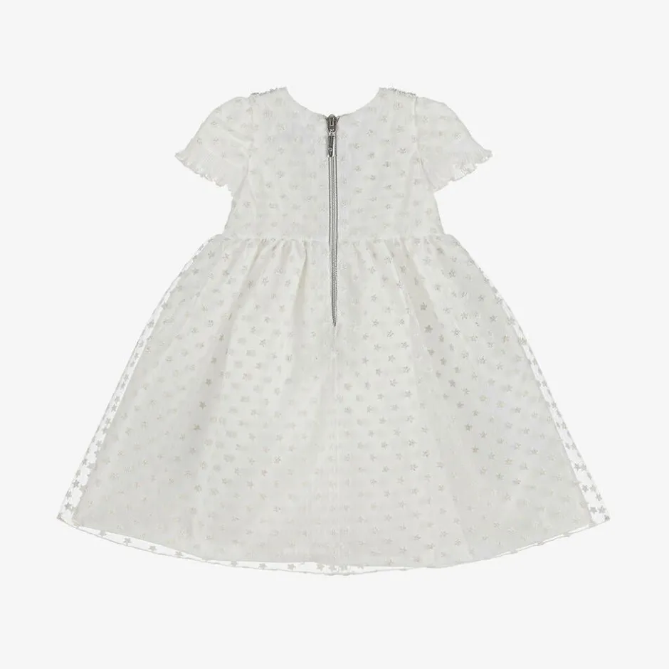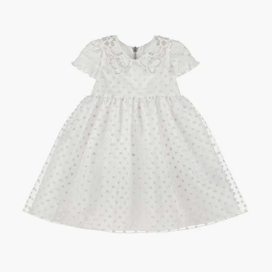 A beautiful white dress for baby girls by Spanish brand Graci, ideal for special occasions. Covered with glittery stars, this pretty design has embroidered flowers and silver beaded detailing on the scalloped collar. The bow-shaped brooch on the neckline has a detachable pin fastening and diamanté embellishments for extra sparkle. There are pleated frills on the short sleeves and an exposed silver zip on the back. The fabric has a fine net structure and is lined with silky smooth material and a layer of cotton for a comfortable feel next to the skin.