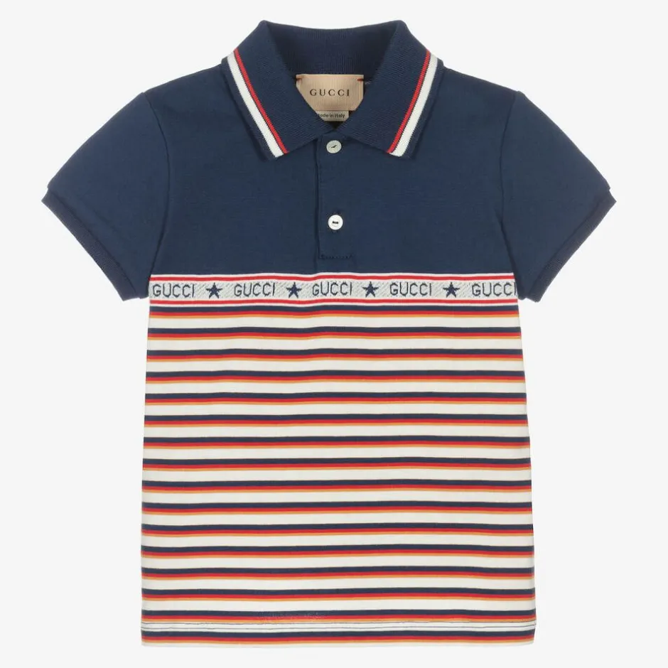 Navy blue polo shirt for baby boys by luxury Italian brand Gucci, made from comfortable cotton jersey. In shades of red, white and mustard yellow, this striped polo has a distinctive Gucci trim on the front and back with a knitted star pattern. A preppy style, the ribbed collar features red and white striped detailing and is framed with branded button fastenings on the front.