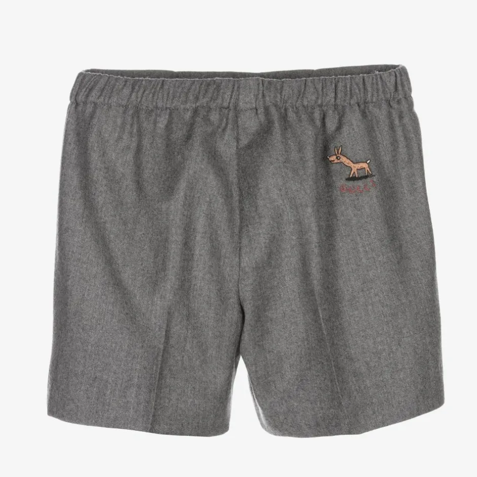 Baby boys smart grey shorts by luxury brand Gucci, made in soft wool and cashmere flannel. They have an orange embroidered logo mythical animal patch on the back by UK children's illustrator Freya Hartas. Fully lined, they have an elasticated waistband for easy dressing and front pleats.