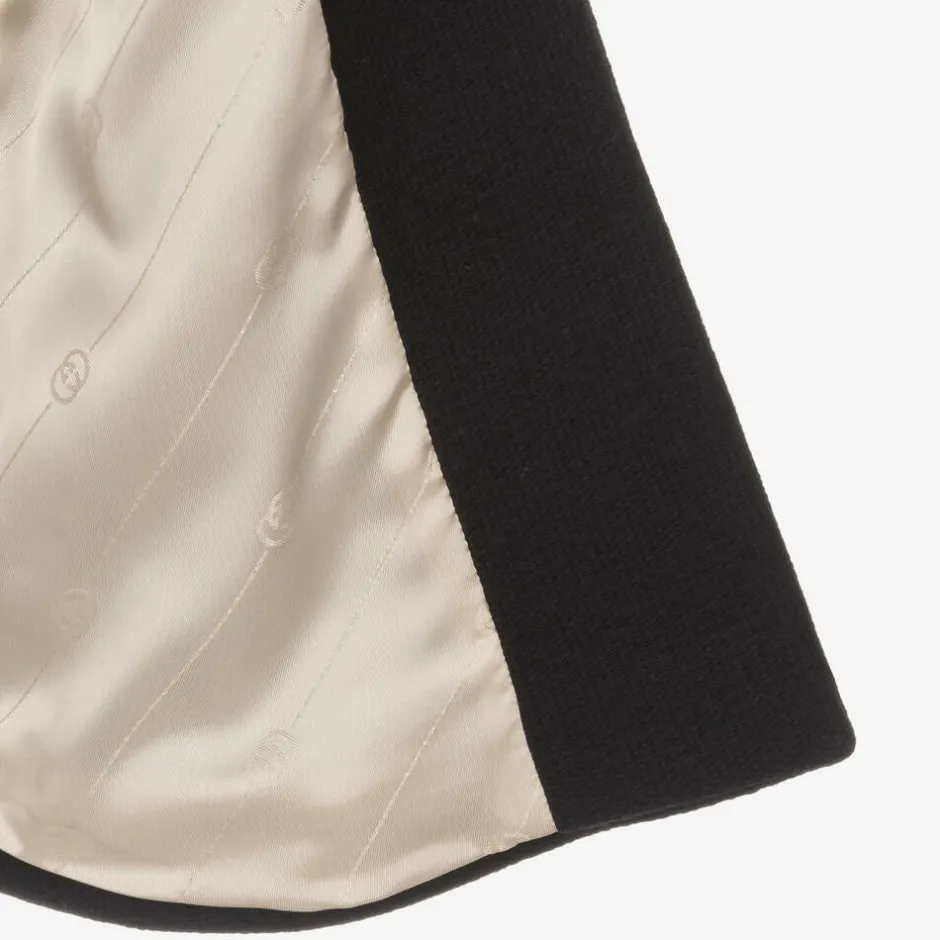 A smart navy blue wool coat for baby girls by the renowned luxury brand Gucci. Classically styled, it has a collared neckline in ivory and red, which coordinates beautifully with the colourblock trim on the front. It fastens with gold-tone, branded buttons and has a silky smooth, Interlocking G lining for added comfort.