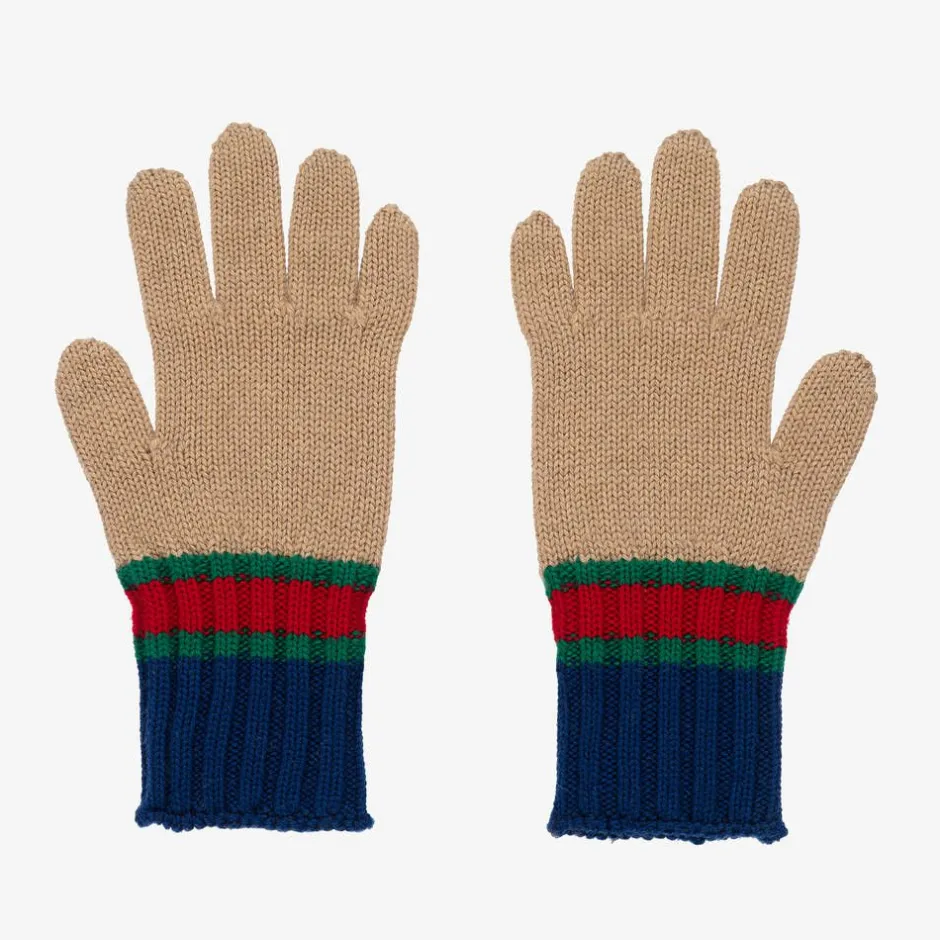 Beige and blue gloves for boys and girls by luxury Italian brand Gucci, made in soft, lightweight wool. Warm and cosy, they have the designer's signature green and red striped Web trim around the wrists.