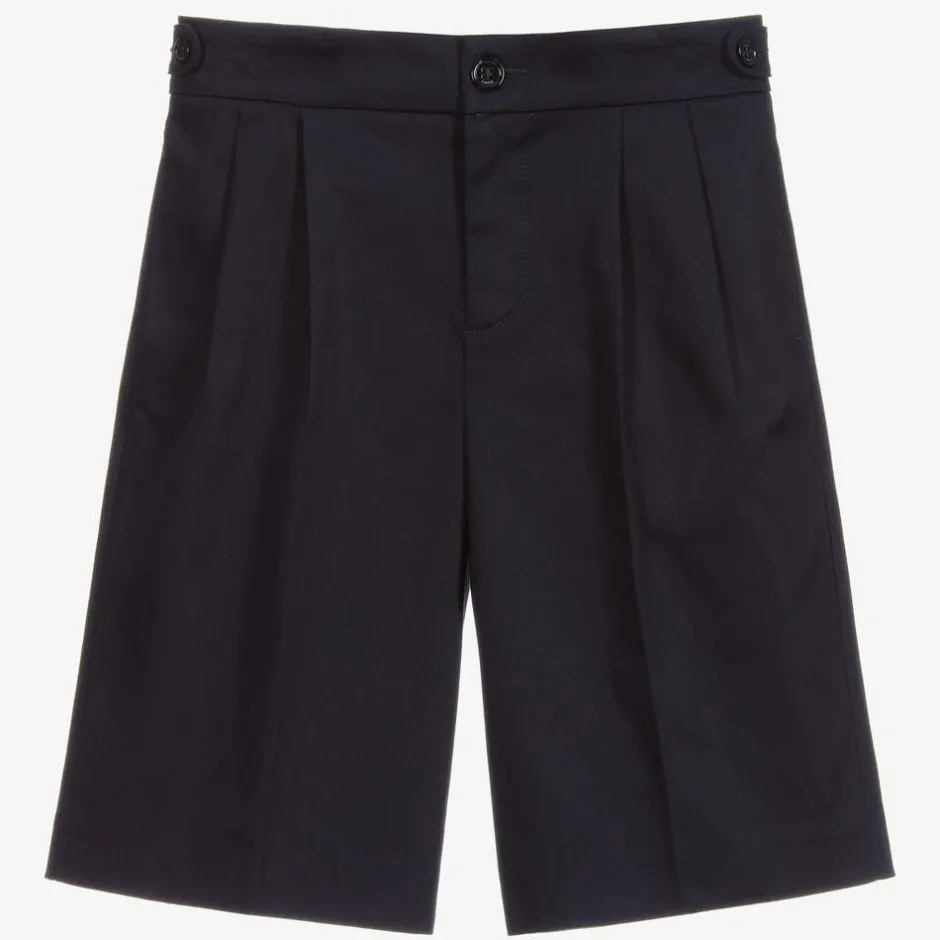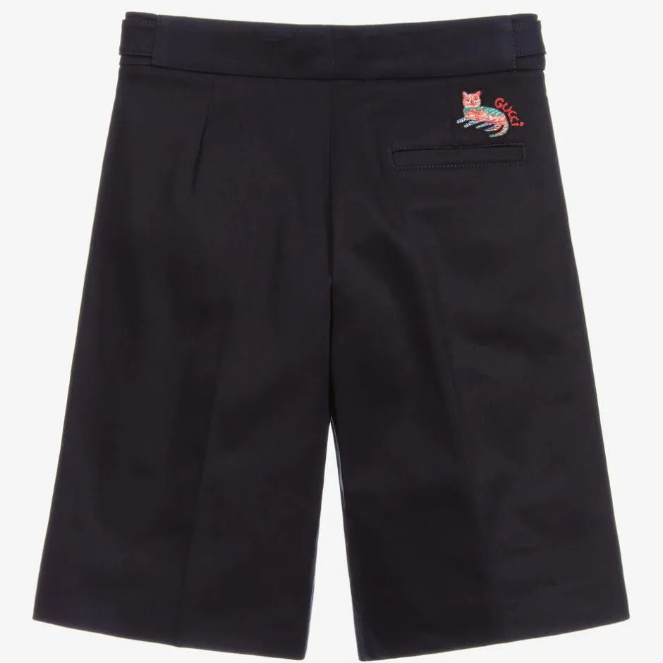 Boys smart navy blue cotton chino shorts by luxury brand, Gucci. Made in stretch gabardine, they fasten with a horn button and zip and have an adjustable waistband and side pockets, with pleats at the front and logo tag on the back.