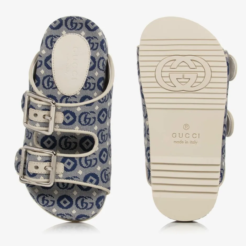 Stylish blue canvas sandals for boys and girls by the luxury Italian brand Gucci. They are patterned with the brand's Double G geometric jacquard and trims with grey leather piping. For a better fit, they have two adjustable straps which fasten with branded chunky silver buckles. The ribbed non-slip outer soles have been embossed with the iconic Interlocking G.