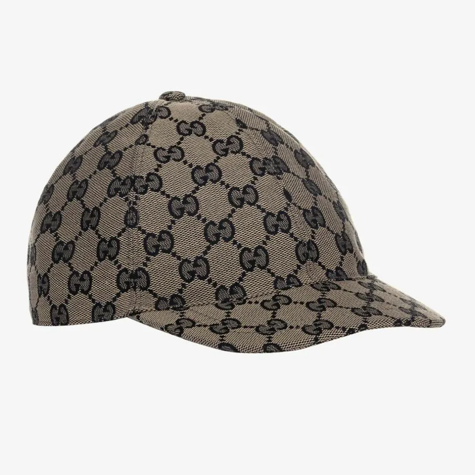 A beige and navy blue GG monogram canvas cap for boys and girls by luxury Italian brand Gucci. It has the signature navy blue and red Web elasticated strap on the back for a comfortable fit. This classic, luxury accessory will complement any smart casual look.