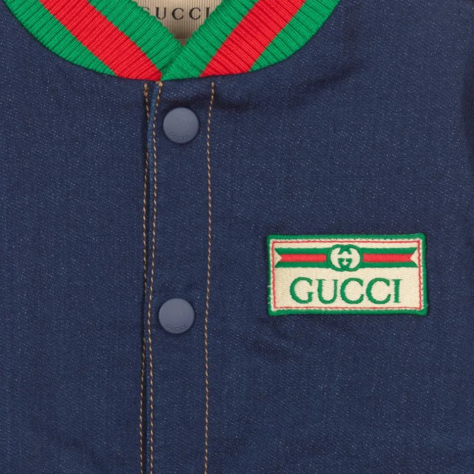 Dark blue bomber jacket for boys and girls by luxury Italian brand Gucci, made from mid-weight cotton jersey with the look of denim. With a cool vintage inspired logo badge on the front, the jacket has contrast yellow stitching and the signature green and red Web stripe on the ribbed trims.