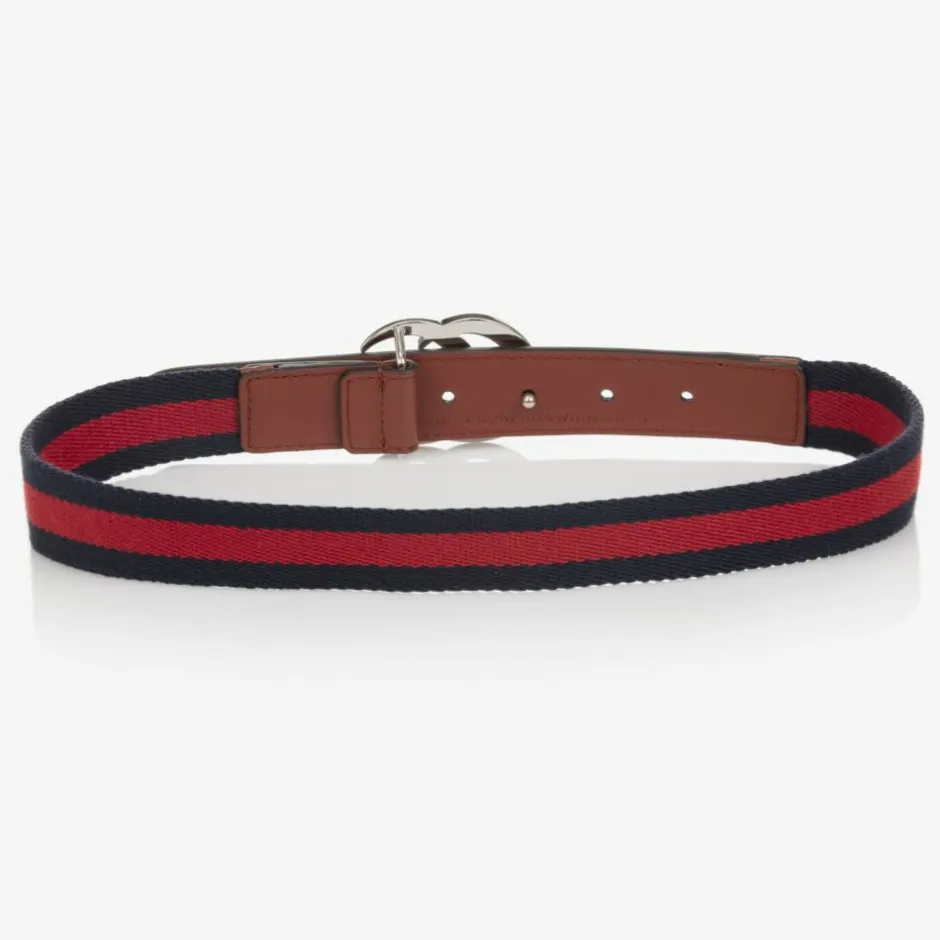 A classic Mini-me navy blue and red striped Web belt for boys and girls from luxury brand Gucci, with dark brown leather trims. The belt fastens with a palladium Double G logo buckle in shiny silver.