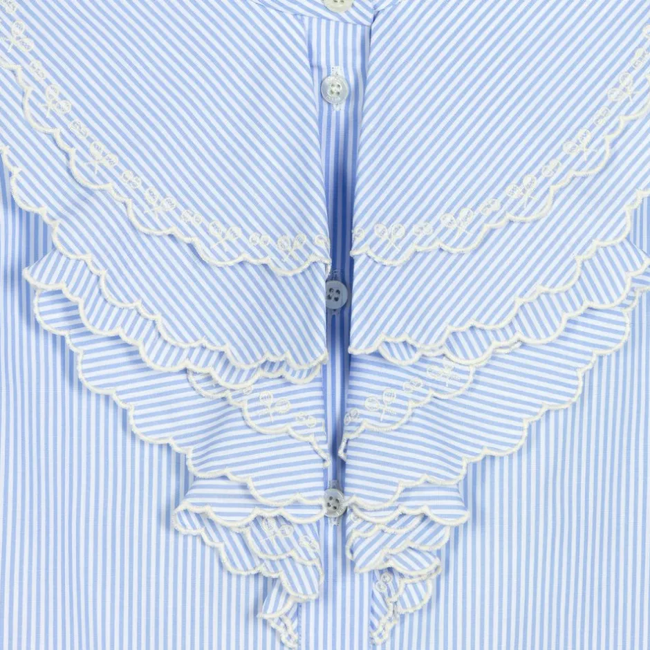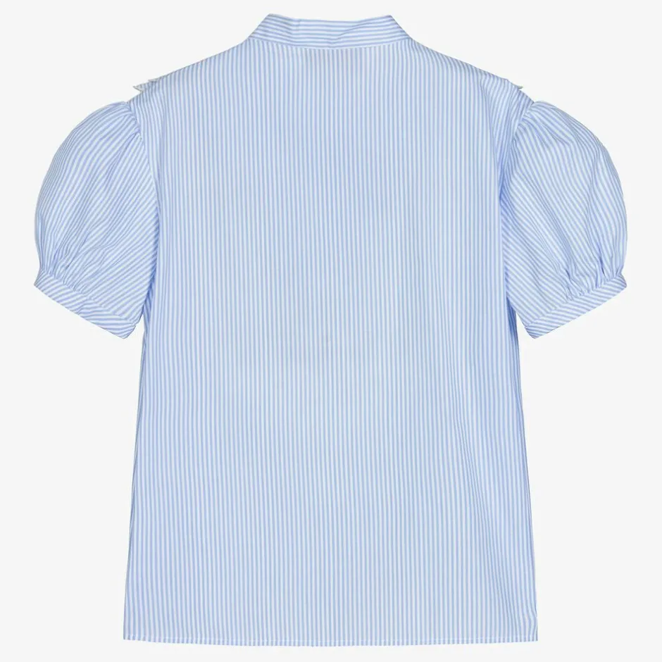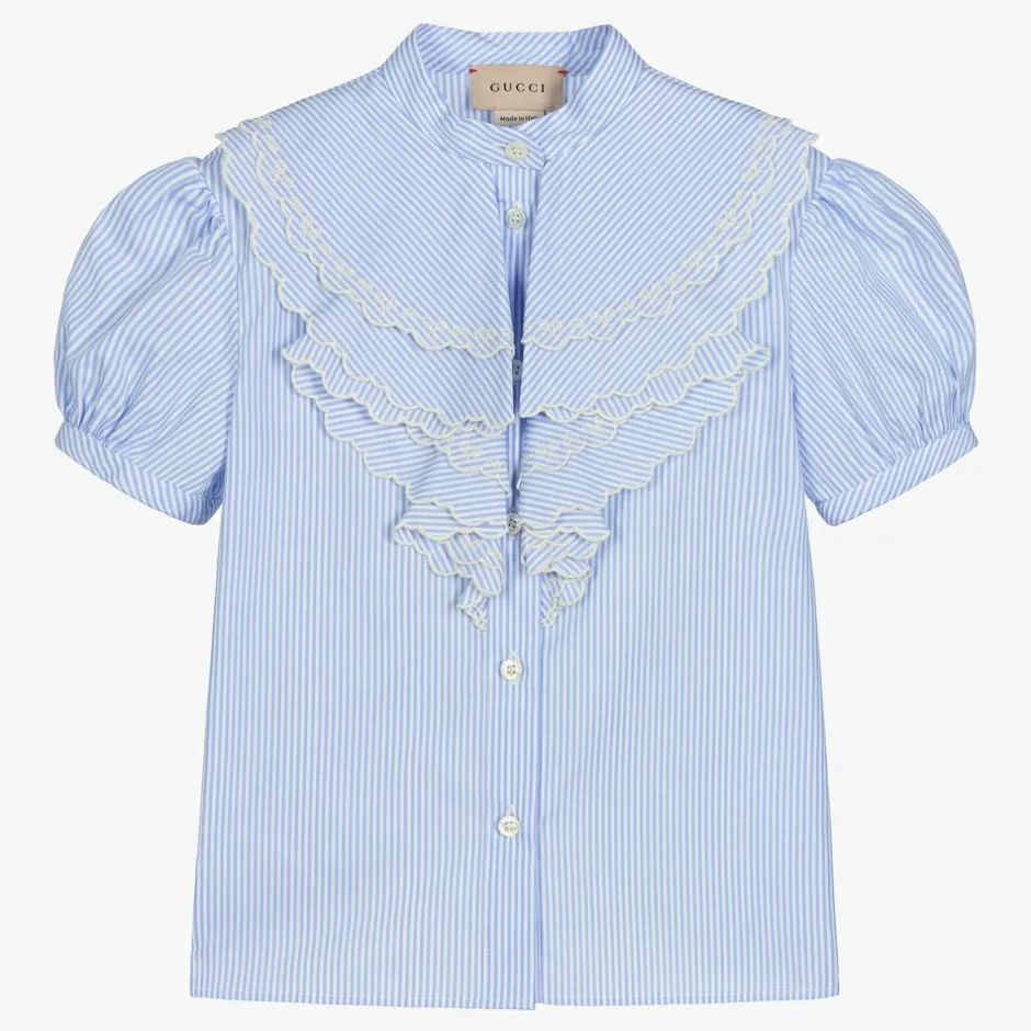 Blue and white striped blouse for girls by luxury Italian designer Gucci, made in soft, smooth poplin. This collarless design features layers of scallop-edged ruffles with delicate tennis racket and GG logo embroidery in ivory. There are puffed sleeves and mother-of-pearl front button fastenings with embossed branding.
