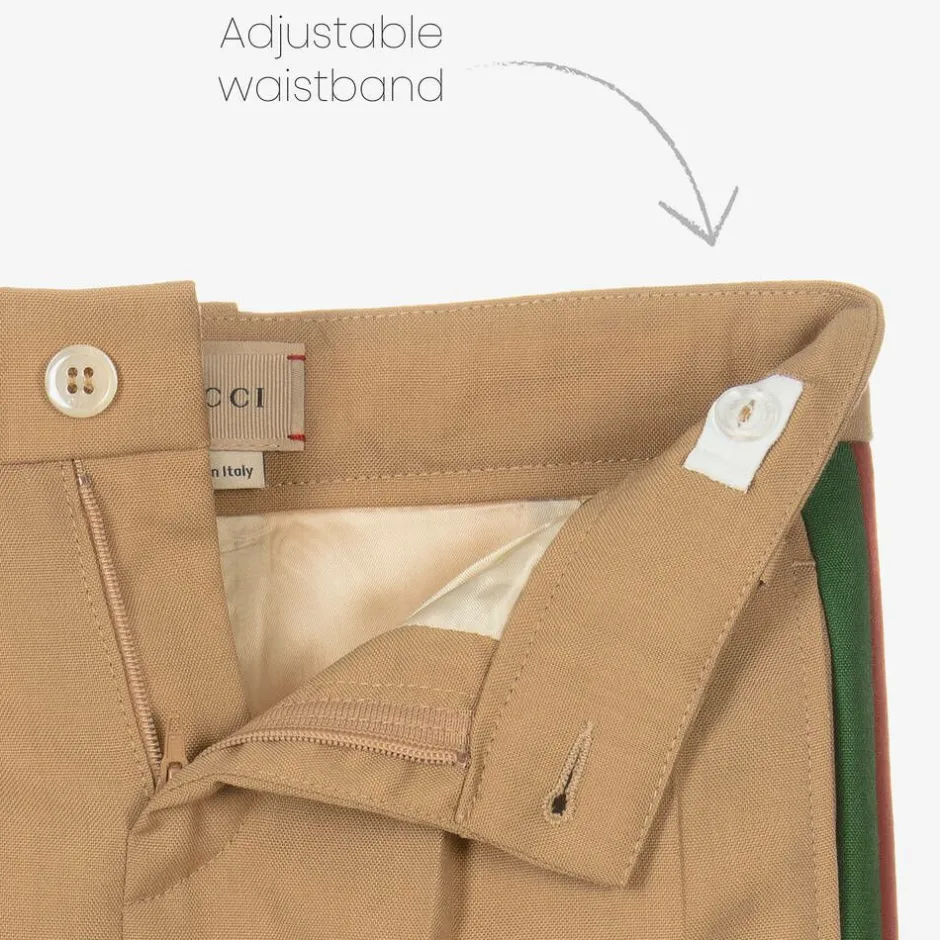 Smart beige trousers for boys, by luxury Italian designer Gucci. Expertly crafted in beautifully soft wool, they epitomise the effortless, yet indulgent luxury of the brand with the red and green Web stripes on the sides of the legs. Easily fastening with a branded button and zip, they have a comfortable adjustable waist, and pleats on the front for a tailored look.