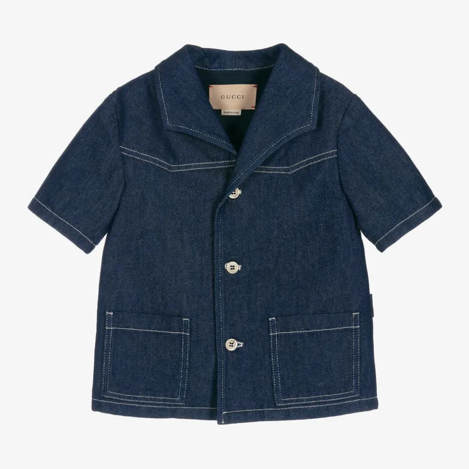 Dark blue short sleeve jacket for boys by Italian luxury brand Gucci, made in heavy weight denim, with a touch of hemp. Premium feel, this button-up jacket has a flat collar, front patch pockets and logo buttons. There is a red and green Web print on the back, with mustard yellow logo embroidery for a cool designer touch.